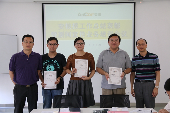 《安糧報》主編沈瑞勇首先匯報了《安糧報》創(chuàng)刊三年來的工作,執(zhí)行總編潘冬生宣讀了《關(guān)于表彰安糧報優(yōu)秀通訊員、優(yōu)秀編輯和先進集體的決定》,安糧實業(yè)辦公室、安糧地產(chǎn)辦公室、安糧期貨辦公室三部門榮獲“先進集體”稱號;趙春進、徐婷、陳凱、丁紹龍4人獲評“優(yōu)秀通訊員”;仲勁松、陶海燕2人獲評“優(yōu)秀編輯”。會議決定增補方嘉亮、李秀芳為《安糧報》編委會成員并明確了《安糧報》通訊員名單和通訊員工作職責。