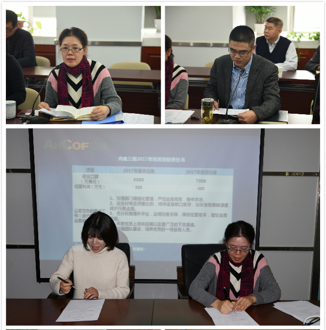 會上,相關(guān)業(yè)務(wù)部經(jīng)理及各子公司負(fù)責(zé)人做了匯報和交流發(fā)言。為了使各業(yè)務(wù)部和子公司更好的完成年度目標(biāo)任務(wù),清晰目標(biāo)任務(wù)的各項(xiàng)要求,會議安排了簡約的簽約儀式,全體業(yè)務(wù)部經(jīng)理及子公司負(fù)責(zé)人與公司鄭重的簽訂了2017年經(jīng)營目標(biāo)任務(wù)書。