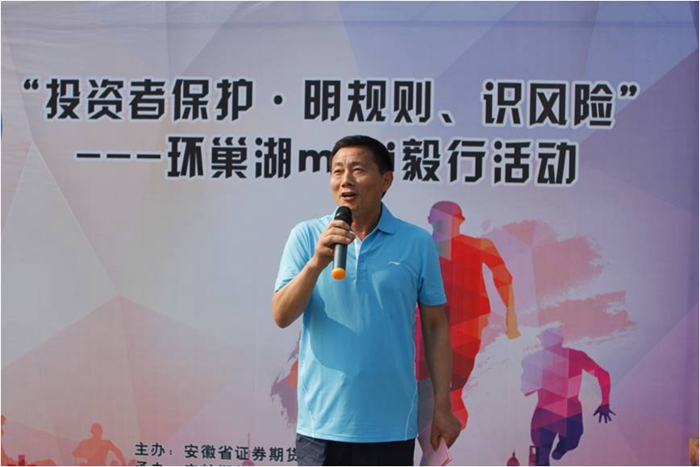 上午八點(diǎn)二十,濱湖新天地廣場(chǎng)上人頭攢動(dòng)、旌旗招展,參加此次活動(dòng)的全體員工在這里集合完畢?;顒?dòng)開始前,安徽省證券期貨業(yè)協(xié)會(huì)副會(huì)長(zhǎng)、秘書長(zhǎng)鐘自木代表協(xié)會(huì)致辭。