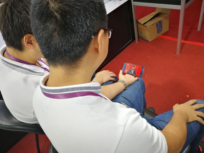 安糧國際員工在廣交會現(xiàn)場用手機觀看十九大開幕式
