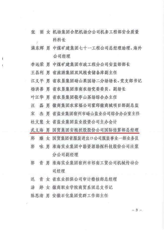 為大力弘揚黨的優(yōu)良傳統(tǒng)和作風,激勵省屬企業(yè)廣大基層黨組織和共產(chǎn)黨員在各自工作中充分發(fā)揮戰(zhàn)斗堡壘和先鋒模范作用,七一前夕,省國資委黨委下發(fā)《關(guān)于表彰省屬企業(yè)先進基層黨組織優(yōu)秀共產(chǎn)黨員優(yōu)秀基層黨組織書記優(yōu)秀黨務(wù)工作者的決定》,安糧控股國際結(jié)算部總經(jīng)理武義海同志榮獲安徽省國資系統(tǒng)“優(yōu)秀共產(chǎn)黨員”稱號。