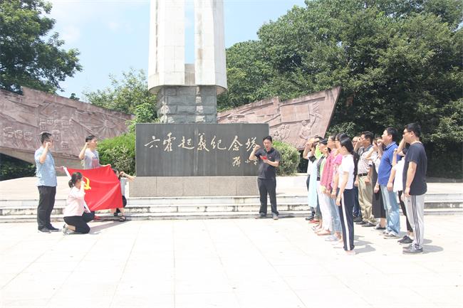 參觀完革命舊址群,頂著烈日和30多度的高溫,攀登144級臺階,大家來到了鄧小平親筆題寫的六霍起義紀念塔,在支部宣傳委員兼紀檢委員、副總經(jīng)理陳建軍帶領(lǐng)下,大家面對黨旗和紀念塔進行了莊嚴的宣誓活動。