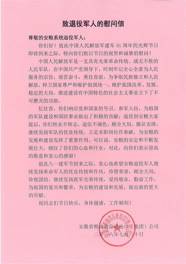 中國人民解放軍建軍91周年節(jié)日前夕,根據(jù)集團(tuán)黨委的部署,集團(tuán)工會慰問了安糧系統(tǒng)全體退役軍人,向他們送上節(jié)日的問候和美好的祝愿!