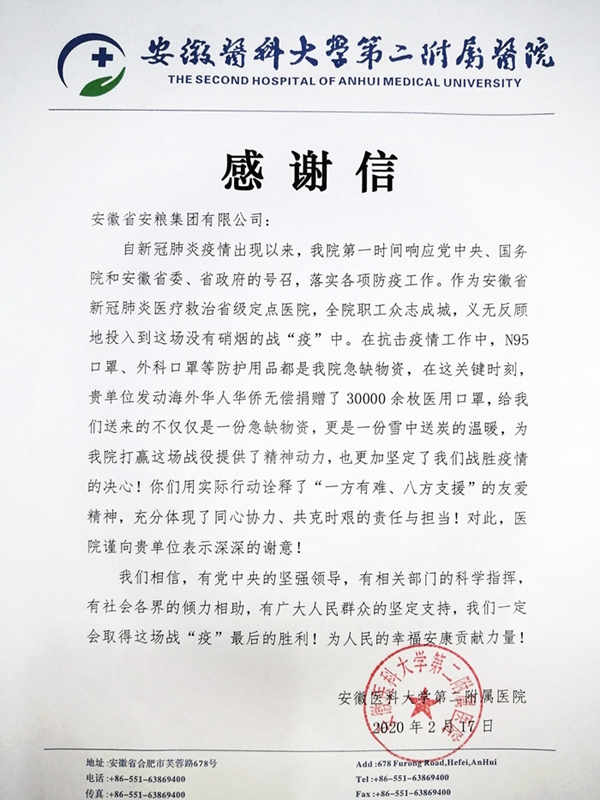 捐贈儀式上,安醫(yī)大二附院黨委副書記高長林親自將感謝信交到安糧實業(yè)黨支部書記、董事長吳國杰手中,正如安醫(yī)大二附院的感謝信中所寫“這不僅僅是一份急缺物資,更是一份雪中送炭的溫暖”,作為安徽省內大型的專業(yè)進出口貿易企業(yè),安糧實業(yè)為疫情防控做力所能及的事情是榮幸,更是一種責任,相信眾志成城,共克時艱,這場疫情阻擊戰(zhàn)就一定能夠打贏!