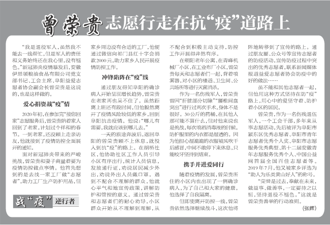黃山人曾榮貴是安徽伊思頓糧油食品有限公司黨支部書記,他是一名傷殘退伍軍人,擔(dān)任阜陽益愛志愿者協(xié)會(huì)副會(huì)長,曾積極參與過大小百余次公益活動(dòng),被評(píng)選為“助人為樂黃山好人”稱號(hào)。在今年新冠病毒蔓延的特殊時(shí)期,曾榮貴不僅捐資戰(zhàn)“疫”,更沖鋒在前。正月初一,他就協(xié)同當(dāng)?shù)卮鍍晌e極投入到防控疫情一線,白天走進(jìn)村委會(huì)和公共場所開展防疫消毒,幫助村兩委工作人員開展出入人員管控;晚上編輯公眾號(hào)文章,宣傳防疫活動(dòng)和防疫過程中的好做法,用行動(dòng)踐行了共產(chǎn)黨員的初心使命,發(fā)揮了黨員的先鋒模范作用。