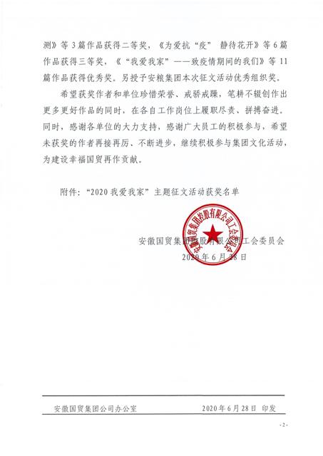 為弘揚(yáng)家國(guó)情懷、豐富企業(yè)文化,國(guó)貿(mào)集團(tuán)工會(huì)組織開(kāi)展了“2020我愛(ài)我家”主題征文活動(dòng)。安糧集團(tuán)工會(huì)積極參與,最終斬獲多項(xiàng)獎(jiǎng)項(xiàng),以最佳的姿態(tài)畫(huà)上圓滿的句號(hào)。