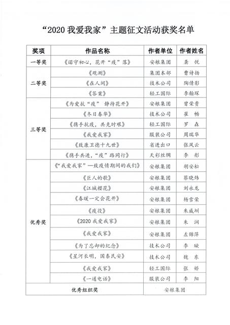 安糧集團(tuán)工會(huì)自接到通知后,組織各分工會(huì)、工會(huì)小組積極動(dòng)員員工,踴躍投稿,共征得稿件42篇,占國(guó)貿(mào)集團(tuán)總投稿數(shù)84篇的一半。最終,安糧期貨龔悅的《諾守初心,花開(kāi)“疫”落》和安糧實(shí)業(yè)曾榮貴的《為愛(ài)抗“疫” 靜待花開(kāi)》分別榮獲一等獎(jiǎng)和三等獎(jiǎng),安糧控股蔡曉煒的《巨人的歌》等7篇作品榮獲優(yōu)秀獎(jiǎng)。安糧集團(tuán)因高度重視、精心組織,特別榮獲優(yōu)秀組織獎(jiǎng)。