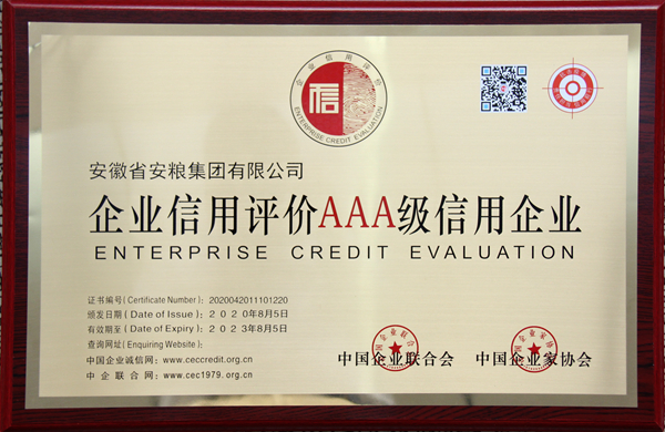 8月20日,中國企業(yè)聯(lián)合會、中國企業(yè)家協(xié)會公布了2020年第一批信用企業(yè)名單,安糧集團(tuán)首次參評榮獲企業(yè)信用AAA等級認(rèn)證。