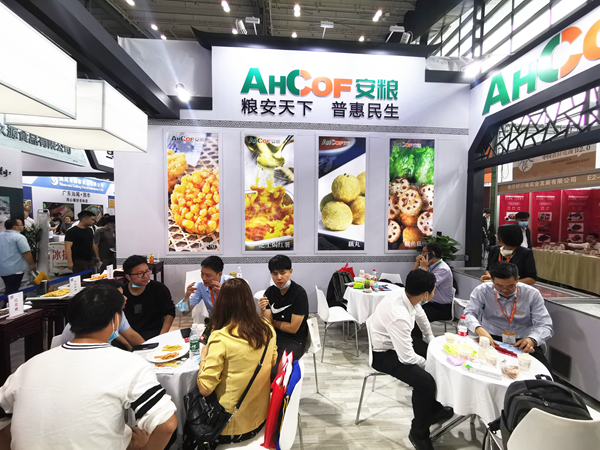 安糧實業(yè)展臺設(shè)計延續(xù)了往年廣受好評的徽派建筑設(shè)計模版,粉墻黛瓦成為一道亮麗的風景線。全新設(shè)計的產(chǎn)品宣傳冊高端精致, 黃金薯條、親嘴藕丸等新產(chǎn)品也引起了同行和觀眾的極大興趣,紛紛表示希望在展會結(jié)束后進行深度對接。