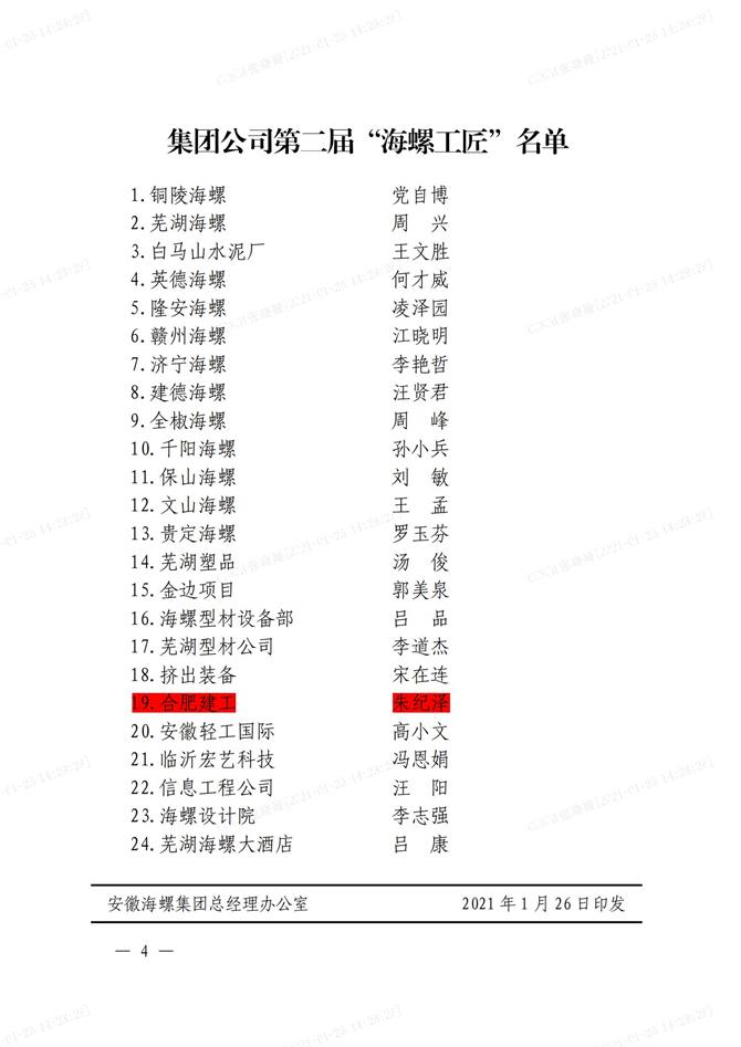 2020年1月26日,海螺集團(tuán)召開(kāi)2021年工作會(huì)議暨第二屆“海螺工匠”表彰大會(huì),授予24名職工“海螺工匠”的光榮稱(chēng)號(hào)。合肥建工朱紀(jì)澤名列其中,成為安糧集團(tuán)系統(tǒng)內(nèi)首位獲此殊榮的員工。