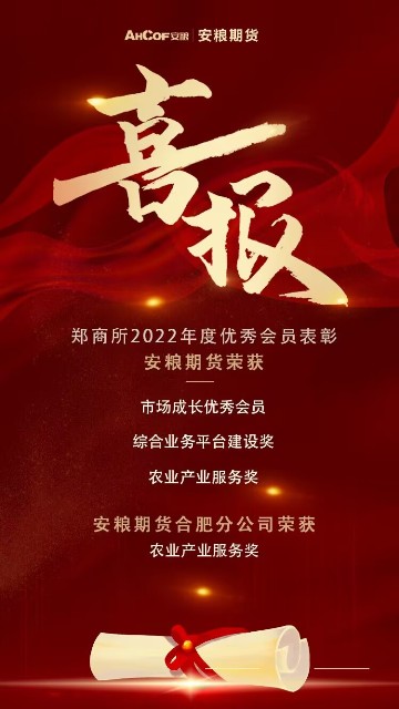 1月30日,鄭州商品交易所發(fā)布關(guān)于表彰2022年度優(yōu)秀會員的決定,安糧期貨榮獲鄭商所“市場成長優(yōu)秀會員”“綜合業(yè)務(wù)平臺建設(shè)獎”“農(nóng)業(yè)產(chǎn)業(yè)服務(wù)獎”三項(xiàng)榮譽(yù),安糧期貨合肥分公司在產(chǎn)業(yè)服務(wù)優(yōu)秀營業(yè)部評選中榮獲“農(nóng)業(yè)產(chǎn)業(yè)服務(wù)獎”。