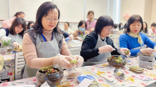微景觀是將苔蘚、多肉等植物配以砂石、泥土、玩偶裝進(jìn)容器,構(gòu)成妙趣橫生的微觀世界,一個(gè)微景觀本質(zhì)上也是一個(gè)小型生態(tài)系統(tǒng)。女職工們?cè)诶蠋煹闹笇?dǎo)下開始微景觀DIY活動(dòng),大家認(rèn)真構(gòu)思造型,充分發(fā)揮創(chuàng)造力,不一會(huì)兒,一份份清新雅致的微景觀作品便呈現(xiàn)在大家面前。在家中、辦公室的案頭擺上一盆,勞累疲乏時(shí)抬頭瞥見那一抹綠色,仿佛跌落到一個(gè)簡(jiǎn)單純凈的童話世界。