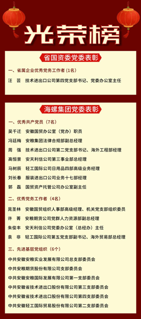 近日,省國(guó)資委黨委、海螺集團(tuán)黨委分別開(kāi)展了省屬企業(yè)和集團(tuán)優(yōu)秀共產(chǎn)黨員、優(yōu)秀黨務(wù)工作者、先進(jìn)基層黨組織表彰,安徽國(guó)貿(mào)所屬技術(shù)進(jìn)出口公司汪蕓同志榮獲省屬企業(yè)優(yōu)秀黨務(wù)工作者稱號(hào),吳千遷等7名同志榮獲集團(tuán)優(yōu)秀共產(chǎn)黨員稱號(hào),晁圣林等4名同志榮獲集團(tuán)優(yōu)秀黨務(wù)工作者稱號(hào),安糧實(shí)業(yè)公司黨總支等6個(gè)基層黨組織榮獲集團(tuán)先進(jìn)基層黨組織稱號(hào)。