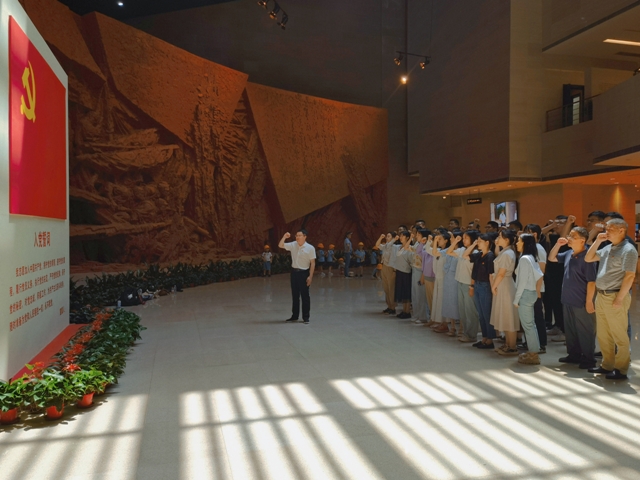 黨員們懷著崇高的敬意,傾聽革命先烈的偉大事跡,瞻仰實物文獻(xiàn),追憶波瀾壯闊的歷史,感受這場軍民團(tuán)結(jié)一心的偉大勝利和永垂不朽的戰(zhàn)役精神?!岸山瓚?zhàn)役的勝利是靠老百姓用小船劃出來的。”習(xí)近平總書記在2020年考察安徽時語重心長地說:“任何時候我們都要不忘初心、牢記使命,都不能忘了人民這個根,永遠(yuǎn)做忠誠的人民服務(wù)員?!彪S后,安糧實業(yè)的黨員們面向鮮紅的中國共產(chǎn)黨黨旗,高舉右拳,重溫入黨誓詞,鏗鏘有力的誓言回蕩大廳、激蕩人心,將不變的初心與使命鐫刻于心。