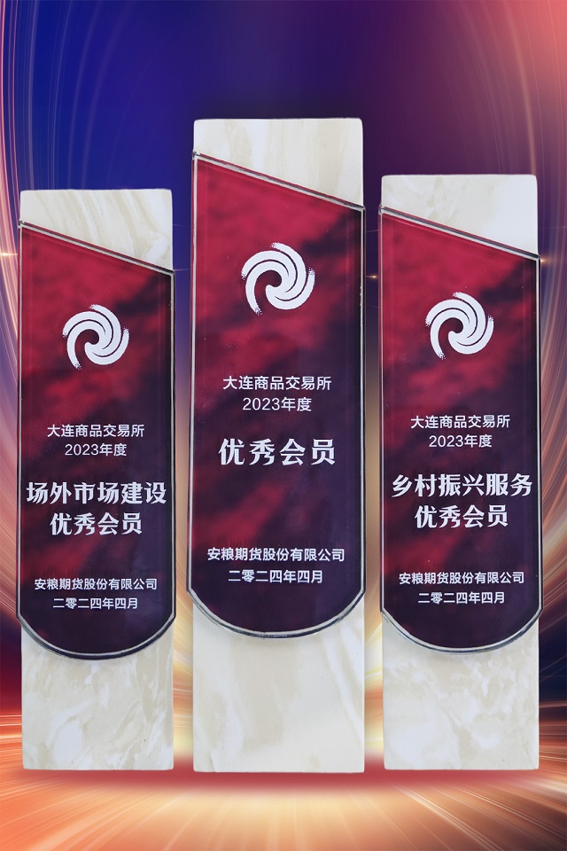 2024年4月8日,安糧期貨在大連商品交易所2023年度優(yōu)秀會員表彰中榮獲“優(yōu)秀會員”、“場外市場建設(shè)優(yōu)秀會員”、“鄉(xiāng)村振興服務(wù)優(yōu)秀會員”三項(xiàng)殊榮。