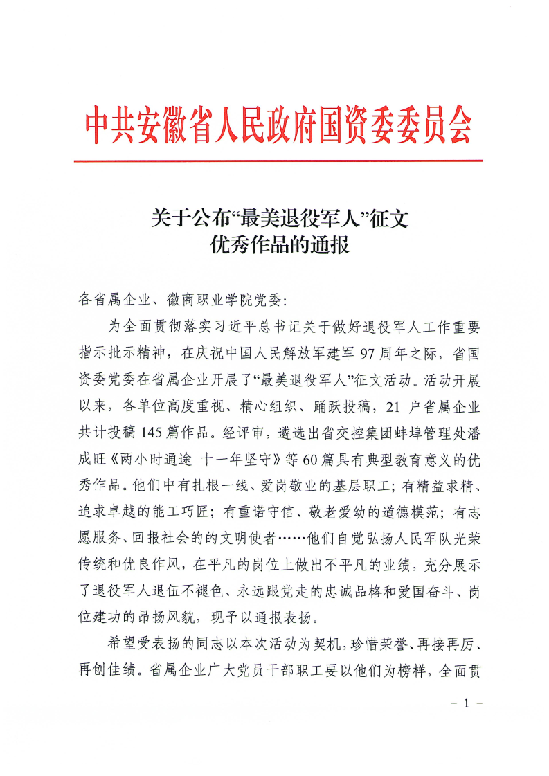 近日,安徽省國資委黨委通報(bào)了“最美退役軍人”征文活動優(yōu)秀作品名單。安糧集團(tuán)選送的兩篇作品《退役不改本色 續(xù)寫奮斗篇章》《揮別軍涯 續(xù)寫華章》均獲評“優(yōu)秀作品”。