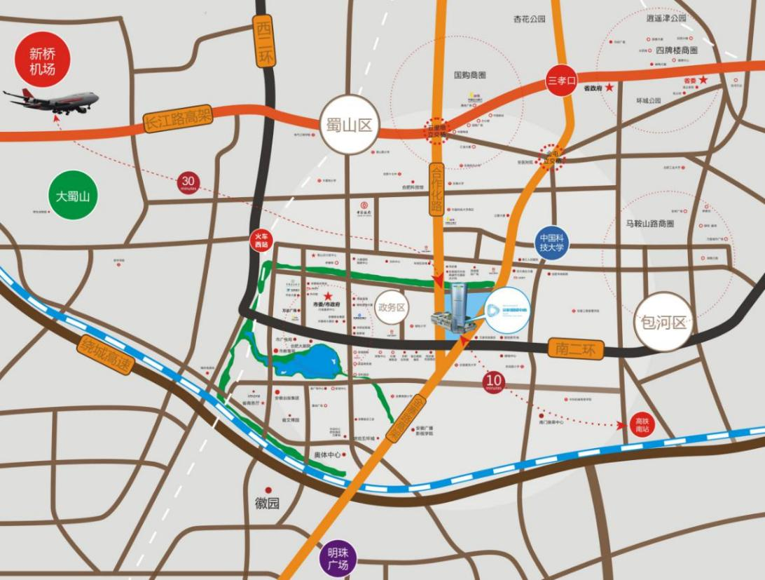 安糧國貿(mào)中心位于安徽省合肥市蜀山區(qū)金寨南路 811 號(金寨南路與南二環(huán)交口西北角),為政務(wù)、蜀山與包河三區(qū)交匯的黃金核心,南二環(huán)、金寨路及合作化路三大主干道交匯的稀缺區(qū)位。合肥市政府政務(wù)中心、奧體中心、合肥大劇院等構(gòu)筑起集政務(wù)辦公、文化演藝、體育盛會、高端商務(wù)于一體的復(fù)合型價值生態(tài)圈,為項目注入源源不斷的消費(fèi)動能與品質(zhì)客群。